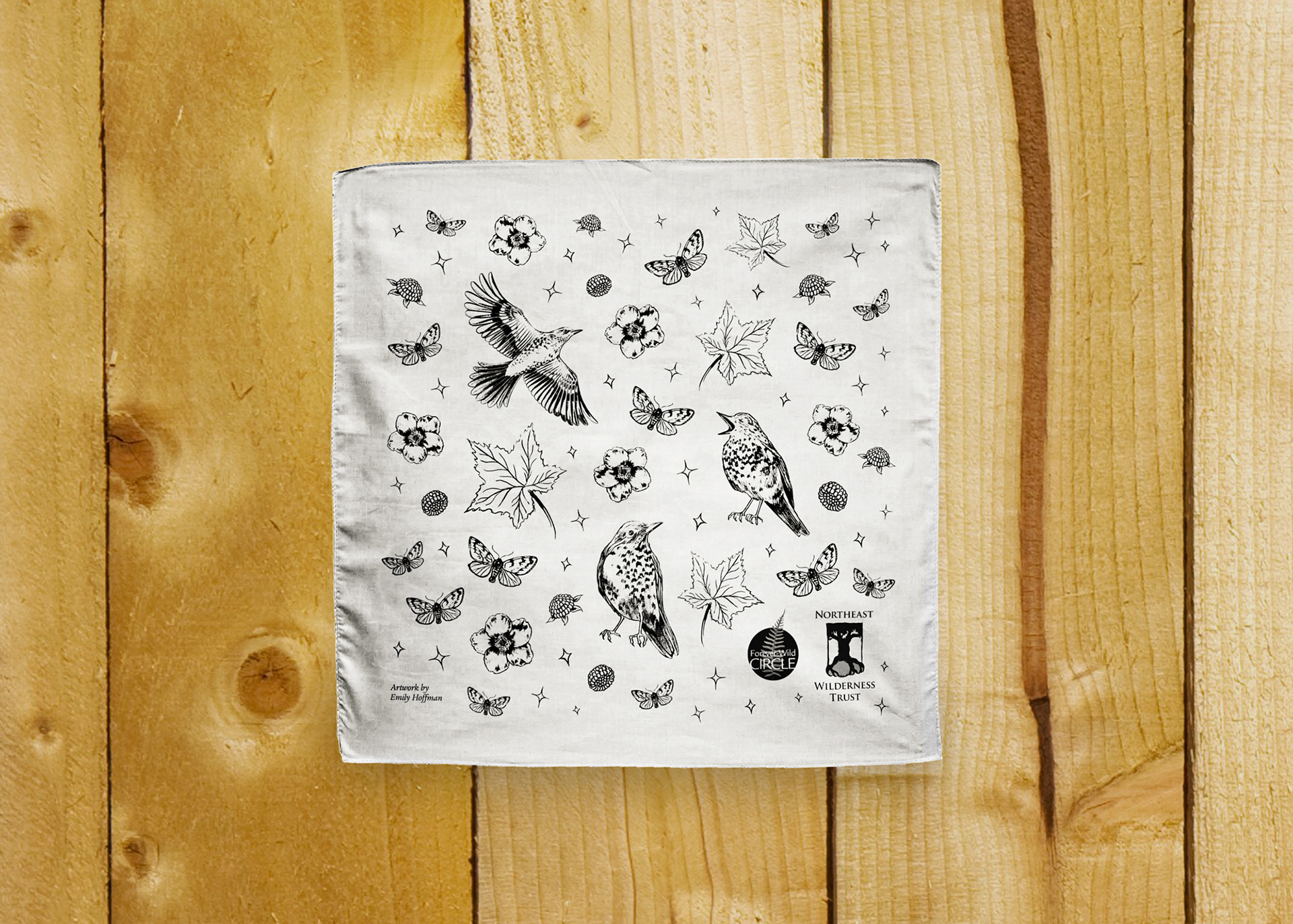 Bandana design for Northeast Wilderness Trust, inspired by the song of the Hermit Thrush in the mystical summer twilight. This 21" square bandana, made with sustainably sourced hemp, was reserved for 2024 monthly donors to the organization. Each year features a limited edition design from a regional artist. Northeast Wilderness Trust is a non-profit land trust on a mission to conserve forever-wild landscapes for nature and people. Become a monthly donor here.